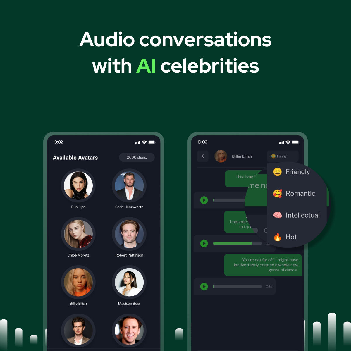 Conversaciones de audio interactivas con personajes de celebridades, potenciada con modelos de inteligencia artificial.