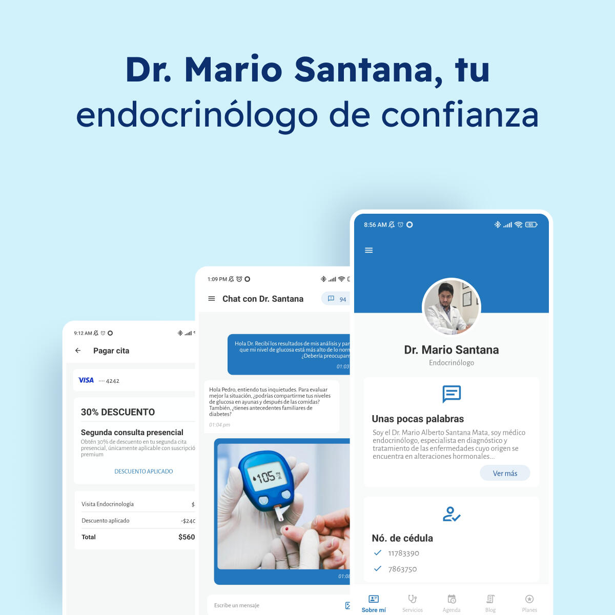 Aplicación del Dr. Santana, especialista en endocrinología. Pagar citas, notas de evolución, descuentos en consultas y más características.